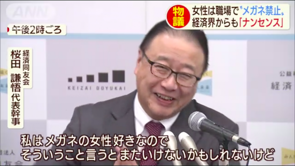 이러한 고충을 대수롭지 않게 여기는 일부 기업인의 태도 또한 물의를 빚었습니다. 사쿠라다 켄고 일본 경제동우회 대표 간사는 TV아사히와의 인터뷰에서 여성의 직장 내 안경 착용 금지와 관련해 "넌센스다. 저는 안경 낀 여자를 좋아한다"라고 웃으며 답해 비판을 받았죠. 여성을 직원이 아닌 '감상물'로 취급하는 시각이 드러났다는 지적이 잇따랐습니다.