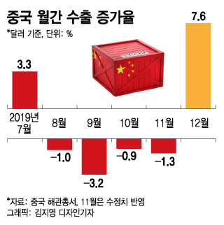 14일 중국 해관총서(관세청)는 중국의 지난해 12월 달러기준 수출이 지난해 같은 달보다 7.6% 늘었다고 발표했다. 이는 시장 예상치(2.9%)와 전월치(-1.3%)를 훨씬 웃돈 수치다.