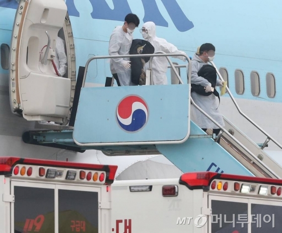 ![[서울=뉴시스] 조수정 기자 = 신종 코로나 바이러스 감염병(우한 폐렴) 발원지인 중국 후베이성 우한시에 남아있던 우리 교민들이 두 번째 전세기를 타고 1일 오전 김포공항에 도착, 비행기에서 내려 차량으로 향하고 있다. 마지막에 내린 이들은 비닐 옷을 덧입고 구급차로 향한 것으로 보아 유증상자로 추정된다. 2020.01.31. chocrystal@newsis.com](https://thumb.mt.co.kr/cdn-cgi/image/f=avif/21/2020/02/2020020916343911787_1.jpg)