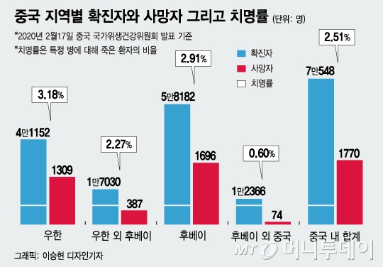 특히 코로나19 확진자가 급증하면서 한때 5%에 육박했던 우한 지역의 치명률은 3.18%로 낮아진 상태다. 후베이외 중국 지역의 치명률은 0.60% 정도다. 중국 전체적으로 보면 치명률은 2.51%다.