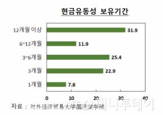 19일 대외경제무역대학 국제경영대학원이 761개 기업대상으로 설문조사한 결과 따르면 현금유동성 유지기간이 3개월 이하인 기업이 30.8%로 조사됐다. 현금유동성 보유기간이 1개월 이하인 곳도 7.8%에 달했다. 나머지 69.2%는 현금유동성 유지기간이 3개월 이상이라고 답했다.