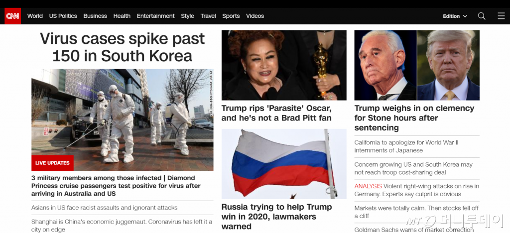 미국 CNN이 21일 오후(한국시간) "한국 코로나바이러스 확진자 150명 이상으로 급증(Virus cases spike past 150 in South Korea)"는 제목의 기사를 뉴스 홈페이지 헤드라인에 걸었다.