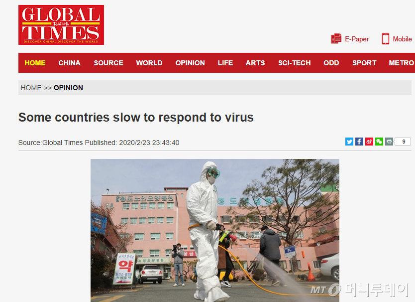 환구시보의 영문 자매지 글로벌타임스도 '몇몇 국가들은 바이러스 대처가 느리다(Some countries slow to respond to virus)'라는 제목으로 같은 내용의 사설을 실으면서 한국의 상황과 방역대책 미흡을 지적했다. 글로벌타임스는 "현재 중국 외에 가장 심각한 영향을 받는 나라는 일본, 한국, 이란, 이탈리아"라며 "이들 국가의 상황은 후베이성 이외의 중국 성과 비교해도 이미 심각하다"고 썼다.