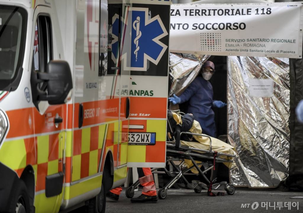 ![[피아첸차=AP/뉴시스]27일(현지시간) 이탈리아 북부 피아첸차 병원 응급실 옆에 설치된 시민보호청 텐트에서 구급차에 실려온 한 여성이 들것에 실려 내리고 있다. 이탈리아 시민보호청은 27일 기준 코로나19 사망자 수가 17명, 누적 확진자 수는 650여 명으로 늘었다고 밝혔다. 이탈리아는 이란과 함께 아시아 외 지역에서 최근 코로나19 확진자가 급격히 늘어난 국가로 꼽힌다. 2020.02.28.](https://thumb.mt.co.kr/cdn-cgi/image/f=avif/21/2020/03/2020030816303332322_1.jpg)