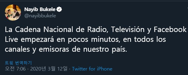 AFP통신에 따르면 나입 부켈레 엘 살바도르 대통령은 11일(현지시간) 앞으로 3주일(21일) 동안 모든 외국인의 입국을 막을 것이라고 밝혔다.
