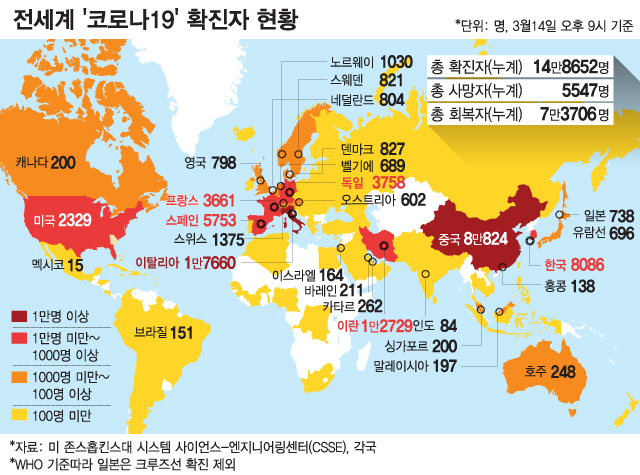 14일 오후 9시(한국시간) 기준 전세계 코로나19 누적 확진자는 14만8652명으로 집계됐다. 사망자는 5547명, 회복자는 7만3706명으로 나타났다.