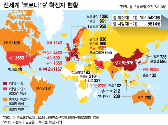 15일 오전 7시13분(한국시간) 기준 미 존스홉킨스대 시스템 사이언스-엔지니어링센터(CSSE)에 따르면 전세계 141개 국가 및 지역(섬 등 포함)에서 15만5423명의 확진자가 집계됐다. 누적 사망자 수는 5814명이다.