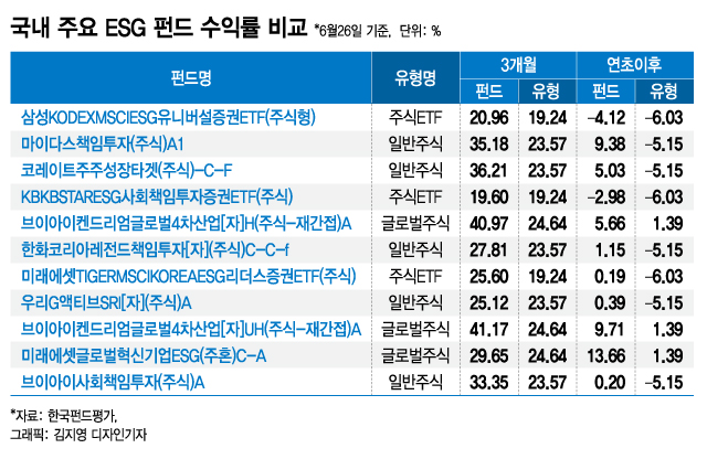 한편 국내에서도 최근 시장 대비 우수한 성과를 내고 있는 ESG 펀드로의 관심이 높아지는 추세다.