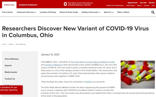 미국 오하이오주립대 벡스터메디컬센터(WMC) 연구진은 13일(현지시간) 미국에서 발생한 것으로 보이는 새로운 변이 코로나19 바이러스 2종이 확인됐다고 밝혔다.