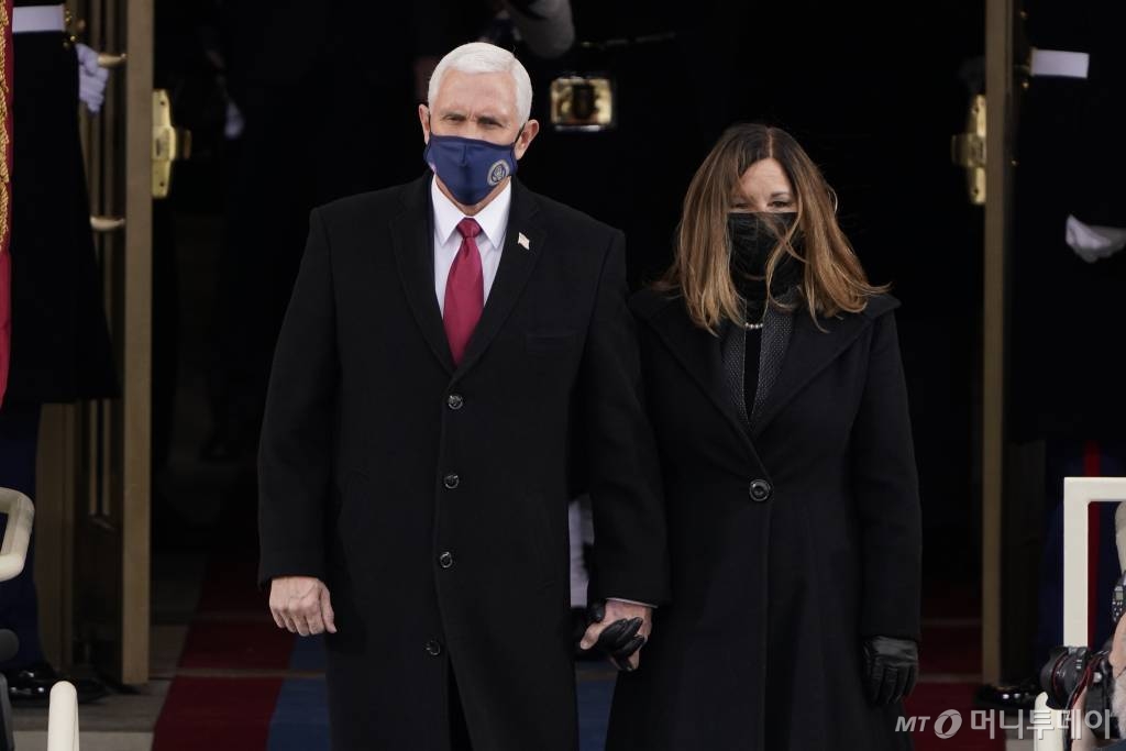 ![[워싱턴=AP/뉴시스]마이크 펜스 미국 부통령과 부인 캐런 여사가 20일(현지시간) 조 바이든 대통령 당선인의 취임식장에 들어서고 있다. 2021.01.21.](https://thumb.mt.co.kr/cdn-cgi/image/f=avif/21/2021/01/2021012101282734315_1.jpg)