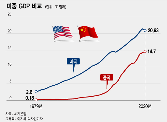 세계은행에 따르면, 달러 기준 중국 국내총생산(GDP)은 1979년 1783억 달러(약 200조원)에서 2020년 14조7000억 달러(약 1경6464조원)로 41년 동안 82.5배 커졌다. 연 평균성장률은 11.4%에 달한다. 같은 기간 미국 GDP는 2조6273억 달러(약 2943조원)에서 20조9300억 달러(약 2경3442조원)로 8배 성장했다. 연 평균성장률은 5.2%다.