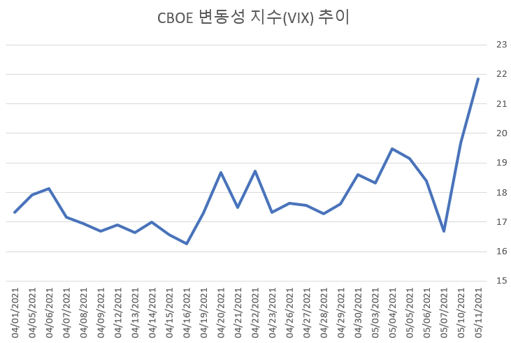 시장의 공포지수로 알려진 Cboe 변동성 지수(VIX)는 이날 11.09% 급등한 21.84를 기록하며 지난 3월22일 이후 최고치를 찍었다. VIX지수는 이날 오전 장중 23.73까지 치솟았다. VIX지수는 지난해 내내 20 이상을 유지하다가 지난달 16 수준까지 떨어졌다. 시장의 공포를 의미하는 VIX지수가 상승하면 증시가 약세를 보일 때가 많다는 점에서 시장은 주목하고 있다.