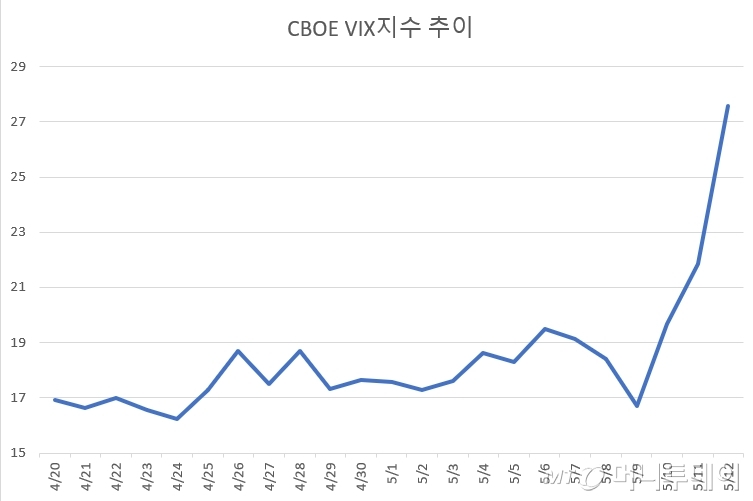 시장의 공포지수로 알려진 Cboe 변동성 지수(VIX)는 이날 26.33% 급등한 27.59를 기록하며 지난 3월8일 이후 최고치를 기록했다. VIX지수는 지난해 내내 20 이상을 유지하다가 지난달 16 수준까지 떨어졌다.