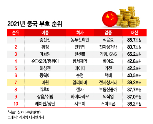 중국 10대 부호 중에선 유일하게 마윈만 재산규모가 줄었다. 지난해 마윈의 재산은 약 51조원에 달했으나 올해 39조2000억원으로 쪼그라들었다. 재산 대부분을 차지하는 알리바바 주가하락과 앤트그룹 상장 중지 여파가 컸다. 그가 정부에 비판적인 목소리를 낸 후 앤트그룹 상장은 중단됐고 알리바바는 엄청난 과징금을 맞았다.