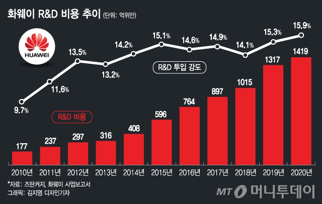 또한 화웨이는 지난해 1419억 위안(약 24조8300억원)을 연구개발에 투자했다. 매출액 대비 R&D 투자를 뜻하는 R&D 투입강도는 2010년 9.7%에서 2020년 15.9%로 꾸준히 상승해왔다. 지난 10년간 화웨이가 연구개발에 쏟아부은 금액은 무려 7266억 위안(약 127조원)에 달한다.