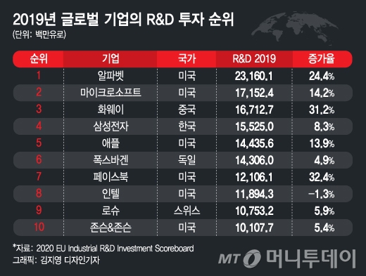 특히 우리가 눈여겨봐야 할 건 2019년 화웨이가 삼성전자를 연구개발 투자규모에서 제쳤다는 사실이다. 지난해 12월 유럽연합(EU)이 발표한 '2020년 EU 산업 R&D 투자 스코어보드'(2020 EU Industrial R&D Investment Scoreboard)에 따르면 2019년 화웨이는 연구개발에 약 167억 유로(약 22조6500억원)을 투자하며 글로벌 3위를 차지했다. 삼성전자는 155억 유로(약 21조원)으로 4위를 기록했다.