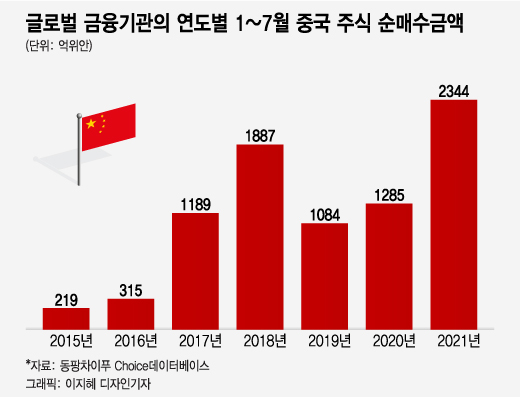 그런데 올해 바이든 대통령 취임 이후 대중 강경 행보에도 불구하고 외국인 투자자의 중국 본토 주식 매수가 급증했다. 올해 1~7월 외국인 투자자의 중국 본토주식 순매수 규모는 2344억 위안(약 41조원)으로 지난해 같은 기간 유입된 1285억 위안(약 22조5000억원) 대비 82% 늘었다.