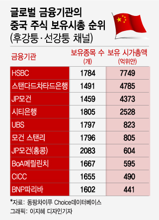 주가 상승분이 반영된 노스바운드 자금의 보유종목 시가총액은 지난 17일 기준 2조4760억 위안(약 433조원)에 달하며 금융기관 별로 보면 HSBC가 보유한 주식의 시가총액이 7749억 위안(약 136조원)으로 1위를 차지했다. 그 다음으로 스탠다드차타드은행과 JP모건이 보유한 주식의 시가총액이 각각 4785억 위안(약 84조원)과 4373억 위안(약 77조원)을 기록했다.