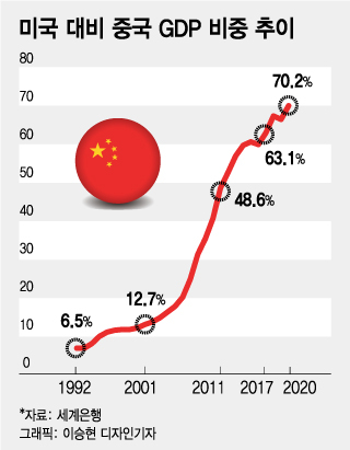 중국의 대외 정책 변화를 이해하기 위해서는 먼저 중국 경제가 어떻게 성장해왔는지 알아야 한다. 1992년 한중수교 당시 중국의 국내총생산(GDP)은 4269억 달러(약 495조원)였으며, 이는 미국 대비 겨우 6.5%에 불과했다. 당시 중국은 1세대 마오쩌둥, 2세대 덩샤오핑에 이어 3세대 지도부인 장쩌민이 국가주석을 맡았지만 덩샤오핑이 막후 실세로 자리 잡고 있던 시기다.