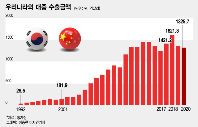 한중수교 이후 우리나라의 대중수출은 급증했다. 1992년 약 27억 달러(약 3조1000억원)에 불과했던 대중 수출규모는 2018년 반도체 특수로 사상 최고치인 1621억 달러(약 188조원)를 기록하면서 26년 만에 61배 증가했다. 대중수출은 2020년 1326억 달러(약 154조원)를 기록하는 등 증가 추세가 꺾였는데, 중국 경제가 성장하면서 자급률을 높이는 등 경제구조가 변하고 있기 때문이다.