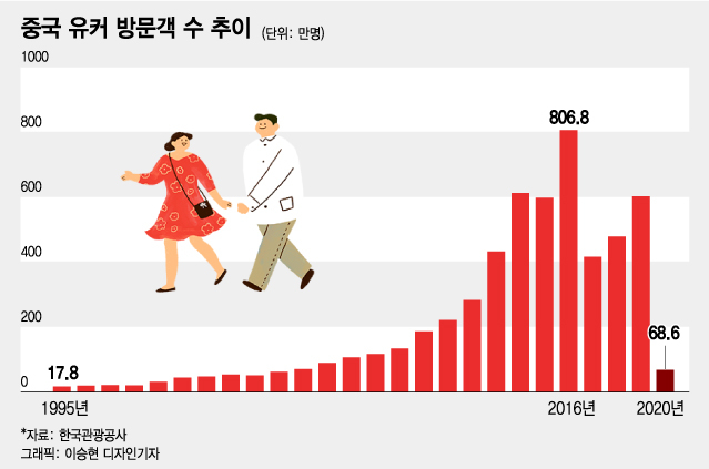 중국 경제의 성장과 한류 영향으로 급증하던 중국 유커 수는 2016년 807만명으로 사상 최고치를 기록한 후 2017년 중국의 사드 제재로 반토막이 났다. 이어 2019년 600만명선을 회복했으나 지난해는 코로나19 여파로 68만6000명으로 급감한 상태다.