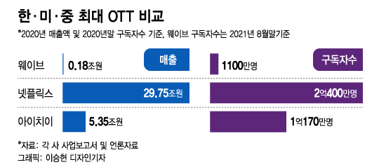 한·미·중 각국 최대 OTT업체 매출액을 비교해 보자. 중국 최대 OTT업체인 아이치이(iQIYI)의 지난해 매출액은 원화로 5조3500억원에 달한다. 넷플릭스(29조7500억원)보다 적지만 한국 최대 OTT업체인 웨이브(1802억원)의 약 30배에 달하는 규모다.