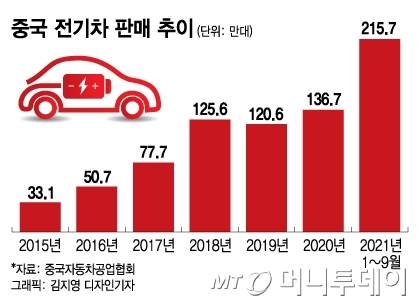 올해 1~9월 중국 전기차 판매량은 전년 대비 185% 급증한 215만7000대를 돌파했다. 현지 업계는 올해 전체로는 300만대를 돌파할 것으로 예상한다. 올해 글로벌 전기차 예상 판매량(약 600만대)의 절반이 중국에서 팔리는 셈이다.