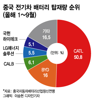 올해 1~9월 중국 전기차 배터리 탑재량 순위를 살펴보자. 중국 배터리업체인 CATL이 배터리 탑재량 46.8GWh, 점유율 50.8%를 기록하며 압도적인 1위를 차지했고 그 뒤를 역시 중국 업체인 BYD, CALB가 이었다. LG에너지솔루션은 배터리 탑재량 5.1GWh, 점유율 5.5%로 4위를 차지하는 데 그쳤다.
