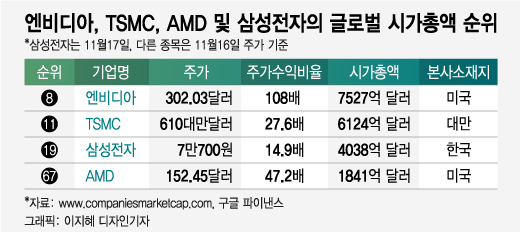 엔비디아는 올해 메타버스 붐을 타고 글로벌 상장기업 시총 8위, 글로벌 반도체 업체 시총 1위로 수직 상승했다. 지난 16일 기준 엔비디아 시가총액은 7527억 달러, 우리 돈으로 888조원에 달한다. 대만 TSMC(6124억 달러, 723조원)보다 20% 이상 크고 삼성전자(4038억 달러, 476조원)의 거의 두 배에 육박하는 규모다.