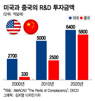 미국과 중국의 총 연구개발(R&D) 투자규모를 보면 중국의 추격이 그대로 드러난다. 2020년 구매력평가지수(PPP) 기준 2000년 미국의 총 R&D 투자는 2700억 달러에 달했지만, 중국의 투자규모는 330억 달러에 불과했다. 하지만 2020년에는 미국(6400억 달러)의 약 90% 수준인 5800억 달러까지 따라왔다.