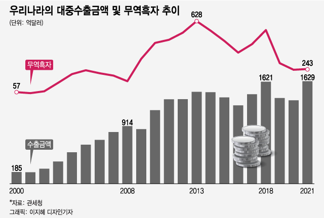 2000~2021년까지 22년간 누적 대중수출 금액은 2조2107억 달러로 같은 기간 우리가 전 세계를 대상으로 수출한 금액(9조3014억 달러)의 23.8%에 달한다. 22년간 우리 수출 중 약 4분의 1이 중국으로 수출됐다.