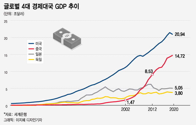 하지만 지금은 다르다. 2020년 중국 GDP는 14조7200억 달러를 기록하며 미국의 70% 수준에 육박한 상태다. 2018년부터 전개된 미중 무역전쟁에서도 볼 수 있듯이 중국은 미국과의 정면대결을 불사할 정도로 거침없어졌다.