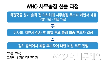 유엔 산하 전문기구인 세계보건기구(WHO) 사무국의 수장인 사무총장은 회원국의 추천, 집행이사회의 심사·투표 등 과정을 거쳐 선출된다. 임기는 5년이며 연임이 가능하다. WHO 설립 이후 특별한 경우가 아니면 대부분 사무총장이 재임을 통해 10년 이상 자리를 지켰다.