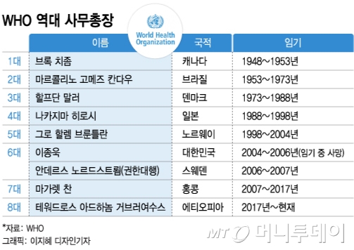 역대 수장 가운데는 2대 사무총장인 마르콜리노 고메즈 칸다우(브라질)가 20년간(1953~1973년) 자리를 지키며 최장수 기록을 세웠다. 3대 사무총장인 할프단 말러(덴마크)는 15년간 WHO를 이끌었다. 나카지마 히로시(4대 총장·일본)와 마가렛 찬(7대 총장 홍콩)도 재임했다. 2004년에는 '한국의 슈바이처'로 알려진 이종욱 박사가 WHO 6대 총장에 올랐지만 임기 중이던 2006년 과로로 사망했다.