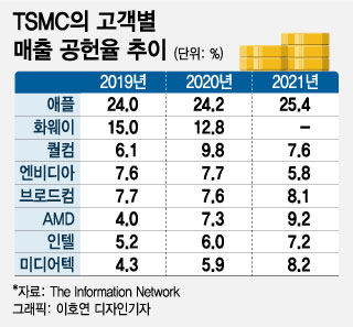 지난해 기준, TSMC 매출 중 25.4%를 애플이 차지했다. AMD, 퀄컴, 엔비디아의 매출 공헌율은 각각 9.2%, 7.6%, 5.8%를 차지하는 등 미국 팹리스(반도체설계) 업체들이 설계한 반도체를 TSMC가 수탁생산하는 공생관계가 형성됐다. TSMC 매출의 60% 이상을 미국 업체가 차지하고 있는 상황이다.