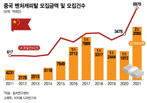 중국 투자전문 연구기관인 칭커연구센터에 따르면 지난해 중국 벤처캐피탈 업계가 조달한 자금은 전년 대비 84.5% 급증한 2조2085억 위안(약 420조원)에 달했다. 신규로 자금을 조달한 벤처펀드도 두 배로 증가한 6979개에 달했다.