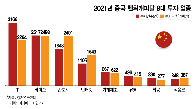 3위는 중국이 처한 특수한 상황이 반영됐다. 반도체 업종 투자건수는 1848건으로 3위를 기록했지만, 건당 투자규모가 크기 때문에 전체 투자금액은 바이오에 맞먹는 2491억 위안(약 47조3300억원)에 달했다. 4위는 인터넷, 5위는 기계제조, 6위는 유통, 7·8위는 화공과 식음료업종이 각각 차지했다.