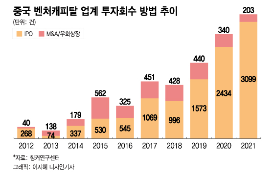 또한 눈여겨봐야 할 대목은 앞서 언급한 것처럼 용이해진 중국 벤처캐피탈의 엑시트(자금회수)가 벤처캐피탈 활성화에 큰 영향을 미치고 있다는 점이다. 근래 중국 당국은 기업공개(IPO)를 허가제에서 등록제로 전환하고 있으며 지난해 11월 중소 벤처기업을 위한 베이징증권거래소를 개장하면서 상장이 수월해졌다.
