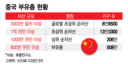 자산규모가 1000만 위안(약 19억원) 이상인 '상위 순자산' 가구는 2% 증가한 206만 가구, 자산 1억 위안(약 190억원) 이상인 '초상위 순자산' 가구는 2.5% 늘어난 13만3300가구를 기록했다. 3000만 달러 이상(약 370억원)을 보유한 '글로벌 초상위 순자산 가구'도 8만8500가구에 달한다. 이들이 바로 중국판 슈퍼리치다.