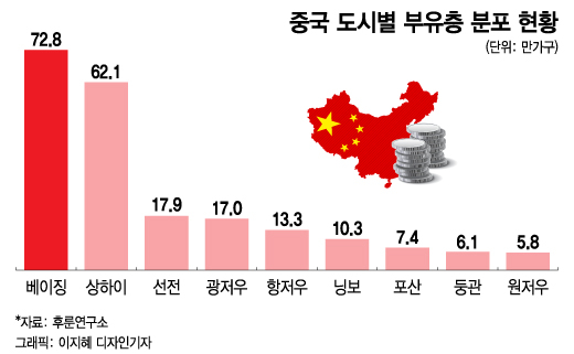 중국 부유층의 지역별 분포도 살펴보자. 수도인 베이징과 경제수도로 불리는 상하이의 부유층이 각각 72만8000가구와 62만1000가구로 압도적인 우위를 차지했다. 베이징과 상하이 양대 도시에 중국 전체의 자원이 몰려 있다는 걸 알 수 있다. 그 다음은 선전, 광저우 등 광둥성에 위치한 도시가 3·4위를 기록했다.