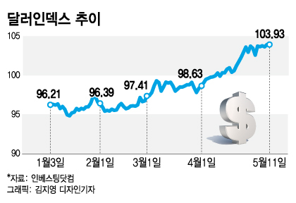 달러화의 상대적 가치는 수십 년 만의 최고치에 도달했다. 주요 6개 통화(유로, 엔, 파운드, 캐나다달러, 스웨덴크로네, 스위스프랑) 대비 달러 가치를 뜻하는 달러인덱스는 지난 6일 한때 104를 넘어서는 등 2002년 이후 20년 만에 최고치를 보였다.