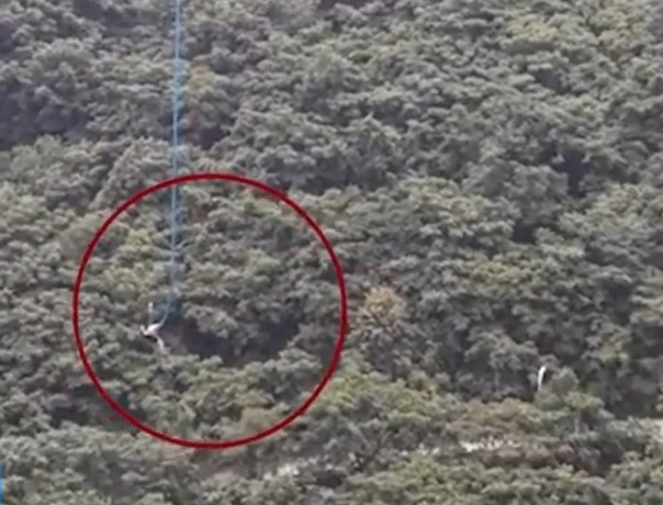 영상에 따르면 한 관광객이 번지점프를 한 뒤 다시 위로 올라가지 못하고 168m 상공에서 대롱대롱 멈춰있다. 영상에는 해당 관광객의 비명 소리도 담겼다.