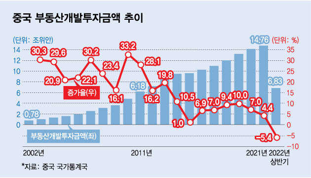 중국 부동산의 불패 신화가 서서히 종료될 가능성이 커보인다. 지난 2분기 중국 경제 성장률은 제로코로나 정책에 따른 고강도 봉쇄정책으로 0.4%를 기록하는 데 그쳤다. 올해 성장률 목표치인 약 5.5% 달성도 불가능할 전망이다.