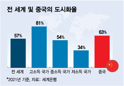 중국 도시화율 역시 부동산 사이클 전환을 전망케 하는 요소다. 그동안 중국 도시화율은 매년 1%p 이상 상승하며 2021년 63%까지 상승했다. 중소득 국가(54%)를 훨씬 초과한 수치다. 앞으로도 중국 도시인구는 계속 늘겠지만, 증가 속도는 느려질 수밖에 없다.