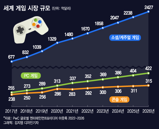 게임 산업은 영화와 음악 산업을 합친 것보다 시장 규모가 크다. 지난해 세계 영화 시장은 약 900억 달러, 음악 시장은 259억 달러 수준이었던 것에 반해 게임 시장은 2100억 달러 이상으로 압도적인 차이를 나타냈다. 단적인 예로 인기 게임 GTA5의 수익은 60억 달러로 세계 최대 흥행 영화 아바타의 수익 28억 달러를 크게 넘어선다.
