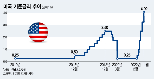 시장도 비슷하게 보고 있다. 시카고상품거래소의 기준금리 예측 프로그램인 페드워치에 따르면 23일 기준 연준이 12월 0.5%p 인상에 나설 확률은 75%를 넘는다. 시장은 이어 내년 첫 두 회의인 2월, 3월에 각각 0.25%p씩 금리가 인상될 것으로 본다. 이 경우 내년 초 미국 금리 상단은 5%가 된다.