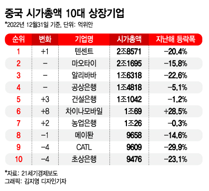 지난해 중국 시가총액 상위 기업의 변화도 컸다. 중국 최대 배달음식 플랫폼 메이퇀(美團), 글로벌 최대 배터리업체 CATL 주가가 하락하면서 시총 1조위안(약 183조원) 클럽은 7개사로 줄었다. 국내 증시에서 시총이 183조원 이상인 기업은 삼성전자(389조원)가 유일하다.