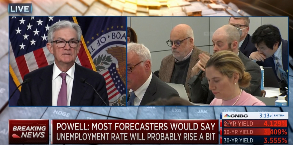 파월 의장은 "연준이 정말 심각한 경기침체나 큰 폭의 실업률 증가없이도 인플레이션율을 2%대로 다시 낮출 수 있다고 생각한다"며 "이미 디스인플레이션(인플레이션율이 낮아지는 단계) 과정이 시작됐고, 특히 상품 가격 등에서 기미가 확실히 나타나고 있다"고 설명했다. 파월은 그러나 "인플레이션과 전쟁에서 우리가 승리를 선언하거나 어떤 확실한 결과를 얻었다고 생각하는 건 매우 시기상조"라며 "이미 디스인플레이션 과정은 초기 단계에 있지만 특히 주택을 제외한 핵심 서비스에서는 그것이 나타나지 않고 있다"고 덧붙였다.