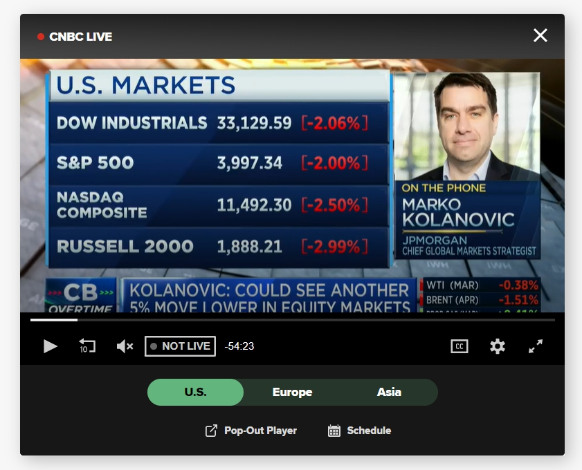 버티던 증시가 기준금리를 한 두 번이 아니라 3번 더 올릴 수 있다는 우려가 터져나오며 이번 주 개장과 함께 추락했다. 중앙은행인 연방준비제도(Fed)가 6월까지 기준금리를 최고 5.5% 범위까지 높일 수 있다는 가능성이다.
