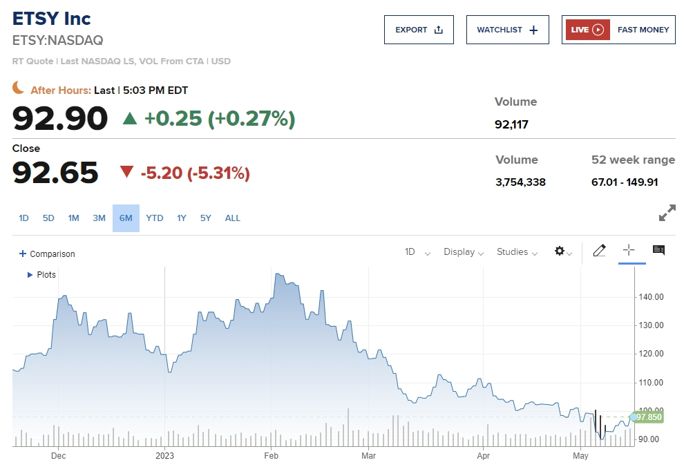 모건스탠리는 이날 엣시(Etsy)의 성장 둔화를 예상하고 주당 목표주가를 79달러에서 74달러로 낮췄다. 엣시 주가는 이 덕분에 5.31% 하락했다. 새 목표가는 월요일 종가 대비 24% 낮은 수준이다.